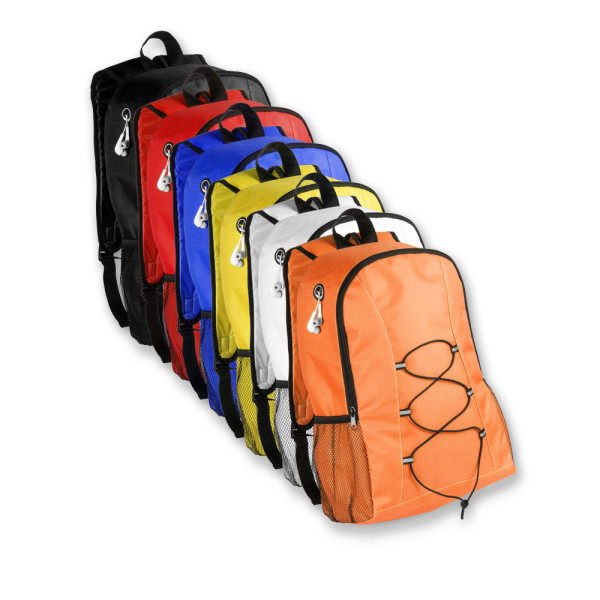PRATICAL AND SPORTS, PADDING BACK, LARGE CENTRAL COMPARTMENT, EARPHONES EXIT, 2 LATERAL POCKETS WITH GRID AND ELASTIC TO BLOCK OBJECTS, STUFFED AND ADJUSTABLE SHOULDER STRAP.