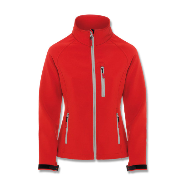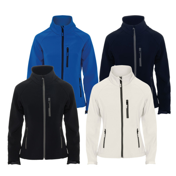 soft and comfortable jacket in soft waterproof and breathable shell, female cutting, windbreakflap under zip, 3 outside pockets with zip, one on the chest, adjustable drawstring waist, adjustable cuffs with Velcro red, black, navy blue, white, royal blue