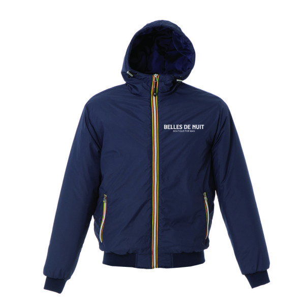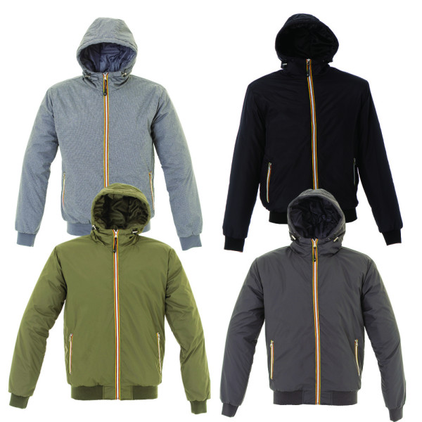 Soft, shiny and waterproof 20D nylon jacket, padded and lined interior, three-coloured zip, padded hood with adjustable drawstring closure, two external zip pockets, 2 internal pockets with Velcro, elasticated knit cuffs and bottom. packaged in a single bag