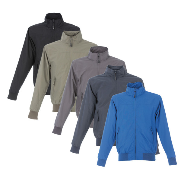 Taslon nylon antiwind lined, raincoat, transpiring net inside, zip, 3 external pockets with zip and 2 pocket inside, covered cuffs and neck with contrast lines, monochromatic elastame waist.