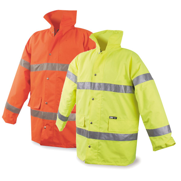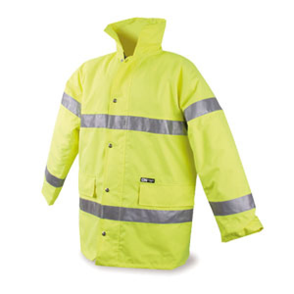 polyester oxford waterproof padded, 2 reflective bands on the body and sleeves with zipper covered by a flap windbreak stop with snaps, lining padded collar is placed in the hood, 2 large outside pockets closed with a flap, 1 inside pocket .