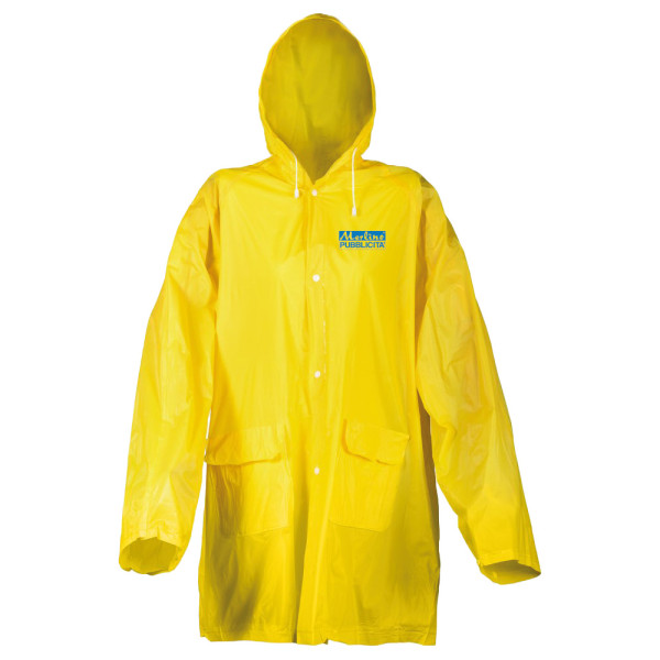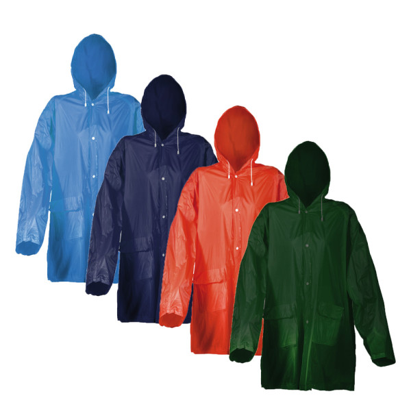 PVC, WATERPROOF GUARANTEE, WITH HOOD AND POCKETS, WRAPPED IN SINGLE ENVELOPE.