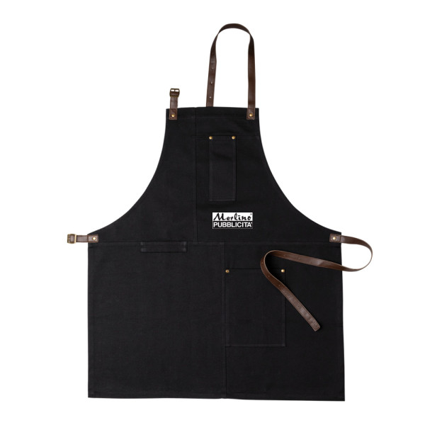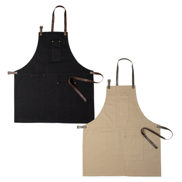 Adjustable apron in waxed canvas with leather details, 2 chest pockets and 2 larger ones on the belly