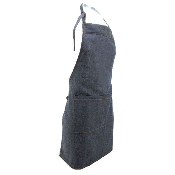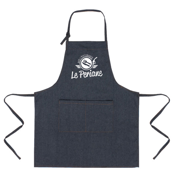 modern design for structure and fabric, made of jeans with ocher-tone seams, the 60% cotton and 40% polyester fabric recreates the denim effect, adjustable neck strap with buttonhole, 2 pockets