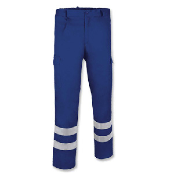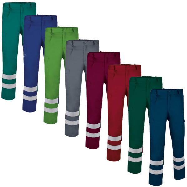 multi pockets Trousers, 2 reflective bands sewn in each leg below the knee, made of durable twill fabric, internal elastic waist on the back for a better fit. 2 slash pockets and 2 large patch pockets closed with a flap and Velcro on the sides of both legs, 1 rear pocket.