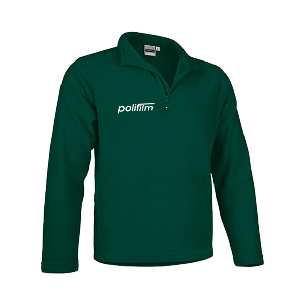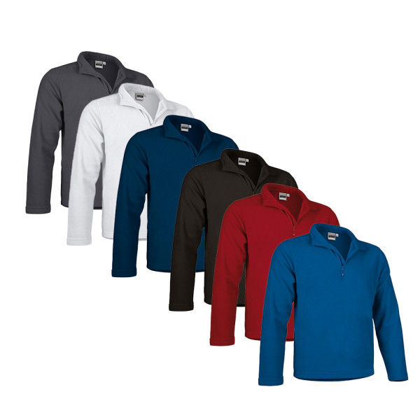 antipilling pile 280 gr, 1 / 2 zip, 2 side pouch pockets with zip, contrast color inside collar, cuffs with elastic waist strap with lock.