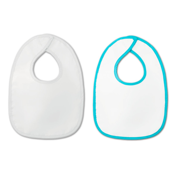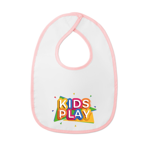 edged in a contrasting color, in 100% cotton on the front and covered on the back to prevent the transfer of liquids. Velcro side closure Colors: pink, light blue, white. wide space for imprinting
