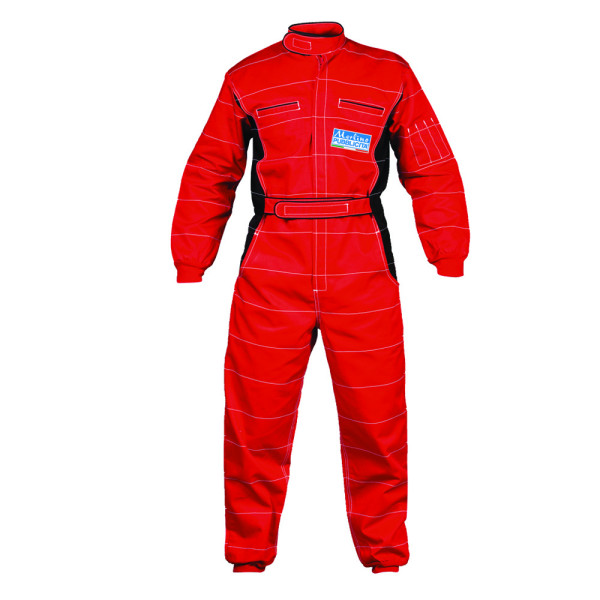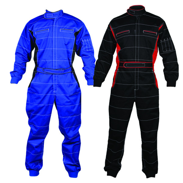 Two-tone advertising "pilot" suit, polyester/cotton blend fabric, long covered zip, white stitching, collar and belt with velcro, elastic waist and back, 2 pockets on the chest, 2 open front pockets, triple pen pocket on the arm , knitted cuffs and bottom of the leg. packaged in a single bag. colors: red, blue, black