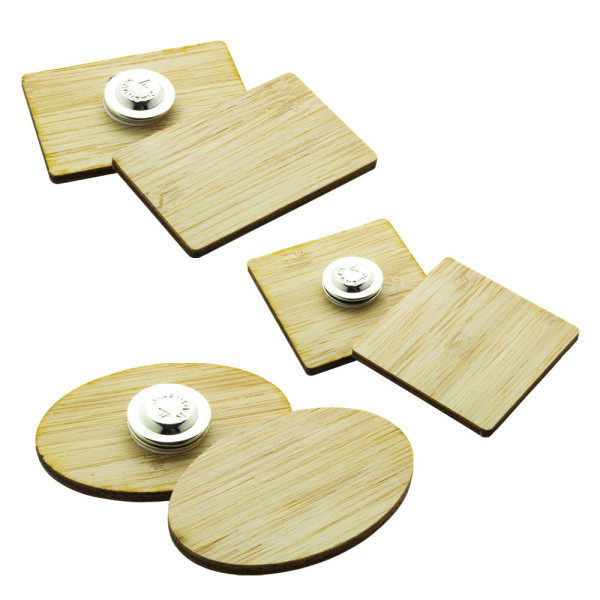 badges made from natural cuts bamboo, available in round, rectangular, oval and square design, with magnetic pin, plenty of room for customization.