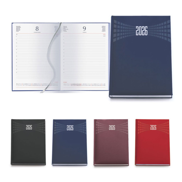 STUFFED COVER WITH DRY IMPRESSIONS, TWO COLORS IMPRINT, SIX LANGUAGES, A PAGE FOR DAY, SEPARATE SATURDAY AND SUNDAY, MONTHLY SUMMARY, TELEPHONE BOOK, BOOK-MARK