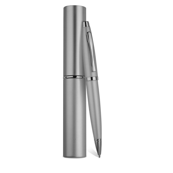 ALLUMINUM BALL POINT PEN , WRAPPED IN METAL BOX PAINTED IN THE SAME COLOR OF THE PEN, STUFFED INSIDE, CHROME PLATED METAL ACCESSOIRES. REFIL: BLACK