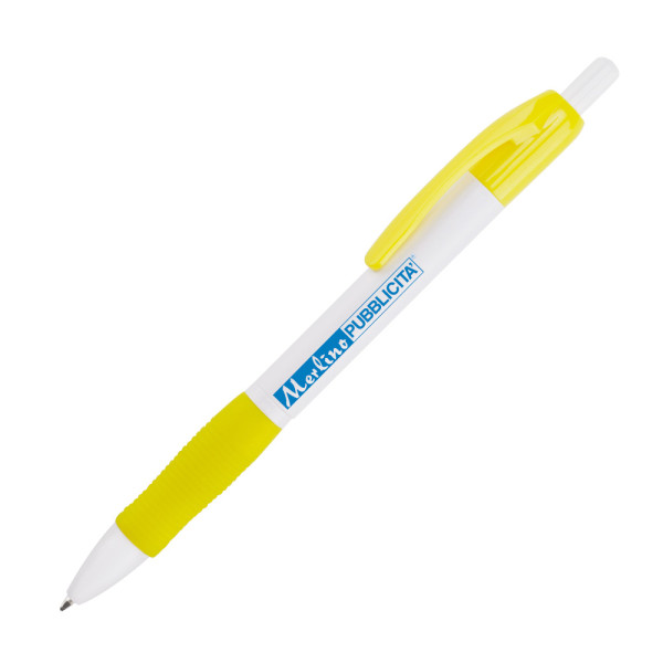 RETRACTABLE BALL POINT PEN, STRENGTHENED TIP, ROUND WHITE STALK, COLORED ACCESSORIES, ERGONOMIC GRIP WITH ANTI-SLIP RUBBER.