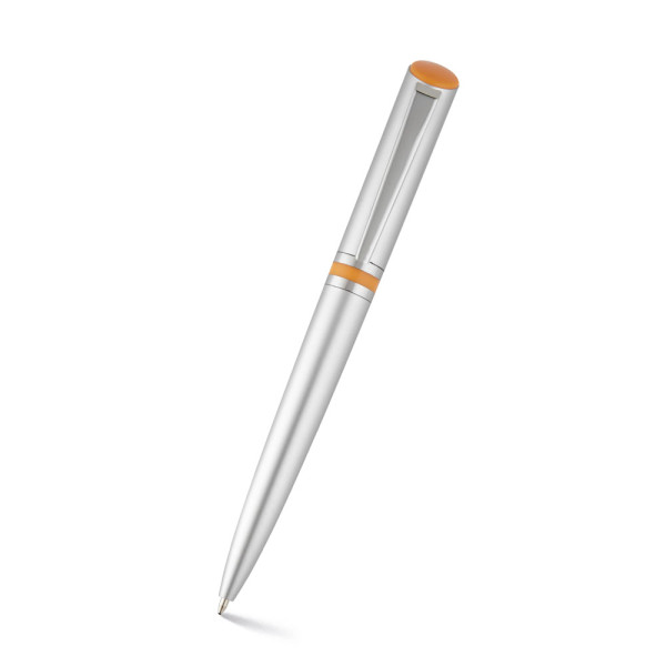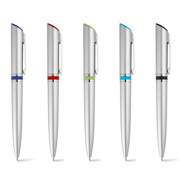 RETRACTABLE BALL POINT PEN, ROUND SATINIZED SILVER STALK, CHROMIUM PLATED METAL CLIP AND RINGS, COLORED ACCESSORIES. refil: blue
