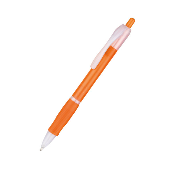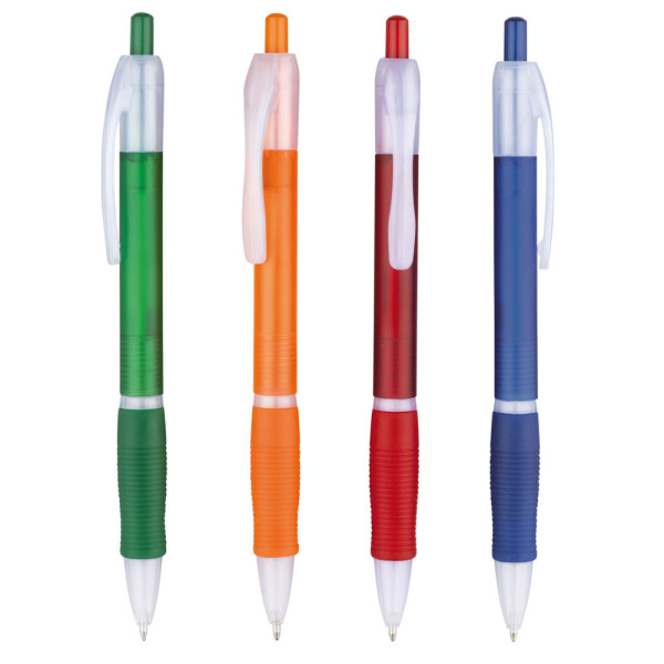 RETRACTABLE BALL POINT PEN, ROUND STALK AND BUTTON SHOCKPROOF PLASTIC COLORED MATERIAL, WHITE SATINIZED CLIP AND TIP, ERGONOMIC GRIP WITH ANTI-SLIP RUBBER WAVY EFFECT. REFIL: BLACK