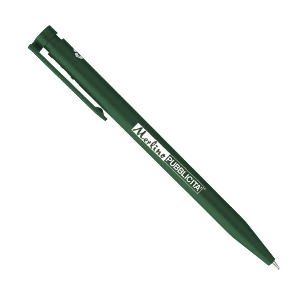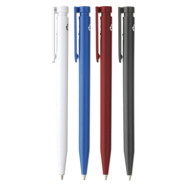Eco-friendly ballpoint pen made with 85% post-consumer recycled ABS from household appliances, barrel and colored details, ample space for customization. Colors: green, gray, orange, red, black, blue Refill: blue