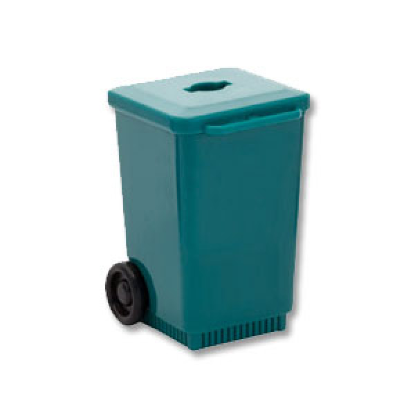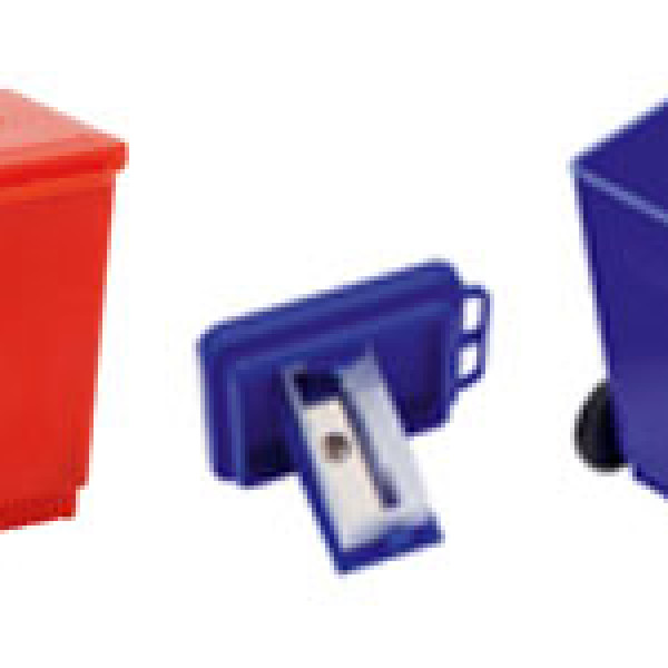 NICE SHARPENER, PLASTIC SHOCKPROOF MATERIAL, DUMPSTER SHAPE WITH WHEEL, REMOVABLE HOOD TO EMPTY THE CONTENT, WIDE SURFACE FOR ADVERTISING IMPRINT