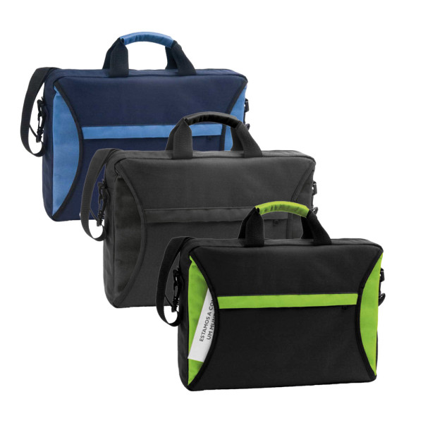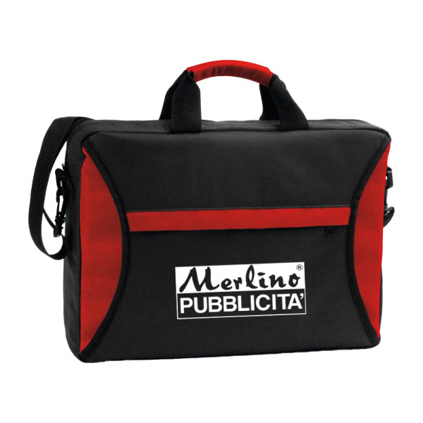 practical and wide in two-color 600D polyester cordura, main compartment closed with zip, external pouch-lined compartment in contrasting color, 2-handle grip, adjustable shoulder strap. Colors: blue, lime green, red, black