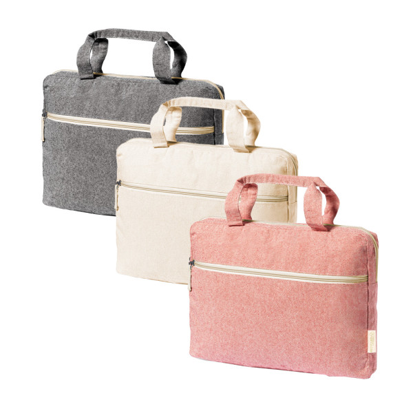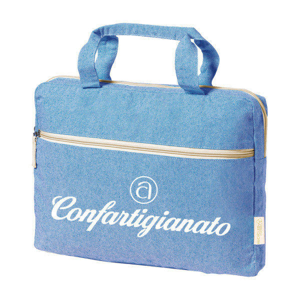 Made from 100% recycled cotton. Main compartment and external pocket with zip closure and external recycled cotton label. Two handle grip. Plenty of room for customization. Colors red, blue, natural, black