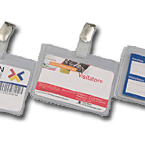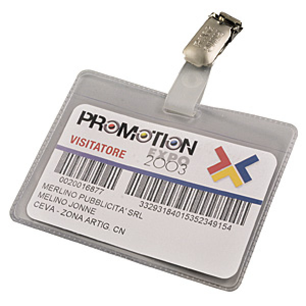 FOR CONFERENCES/FAIRS/VISITORS, IN TRANSPARENT PLASTIC MATERIAL WITH PATENTED LITTLE CLAMP