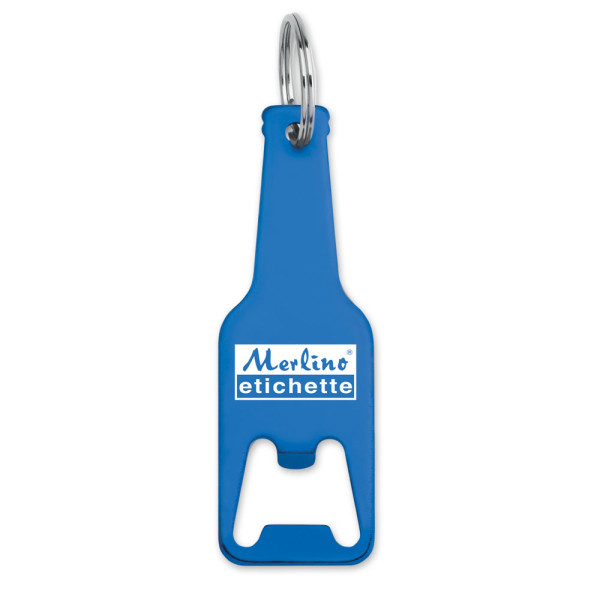 Aluminium coloré en forme de bouteille, avec décapsuleur intégré, bague en bronze, vaste surface pour l'impression.