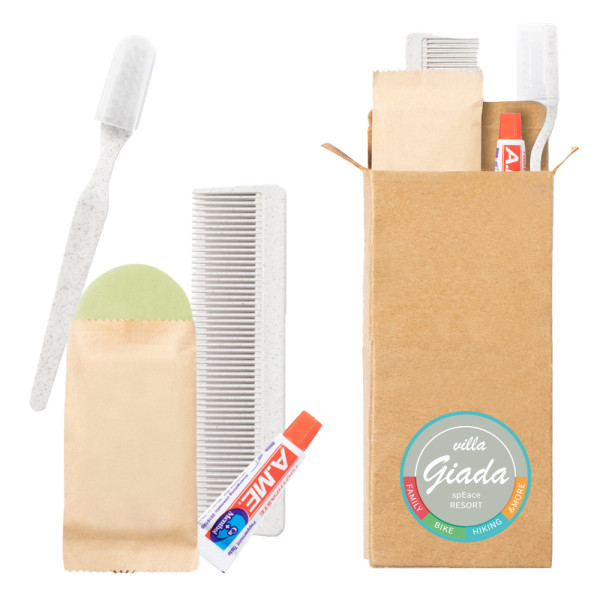 Trousse de toilette essentielle présentée dans un coffret unique contenant une brosse à dents et un peigne en fibre de blé, du dentifrice en tube de 6 g, un pain de savon de 20 g, un espace suffisant pour la personnalisation.