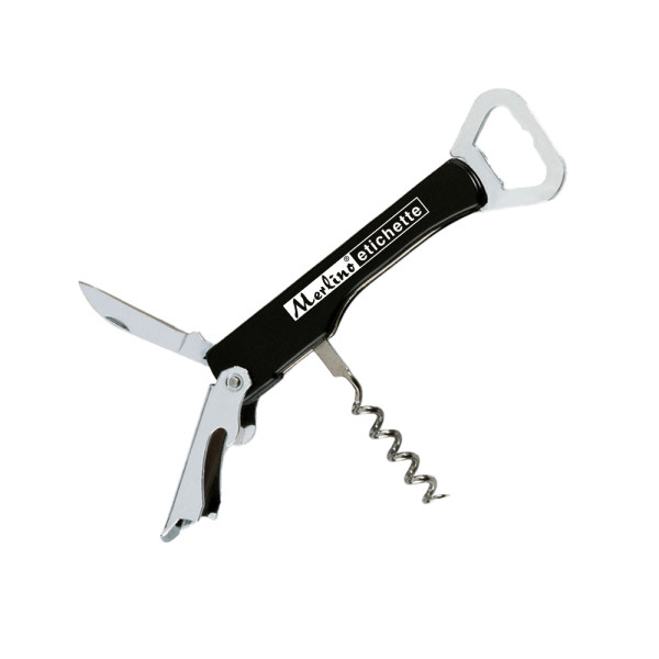 POIGNÉE REVÊTUE, 4 FUNCTIONS: OUVRE-CANETTE, COUTEAU, TIRE-BOUCHON ET DÉCAPSULEUR