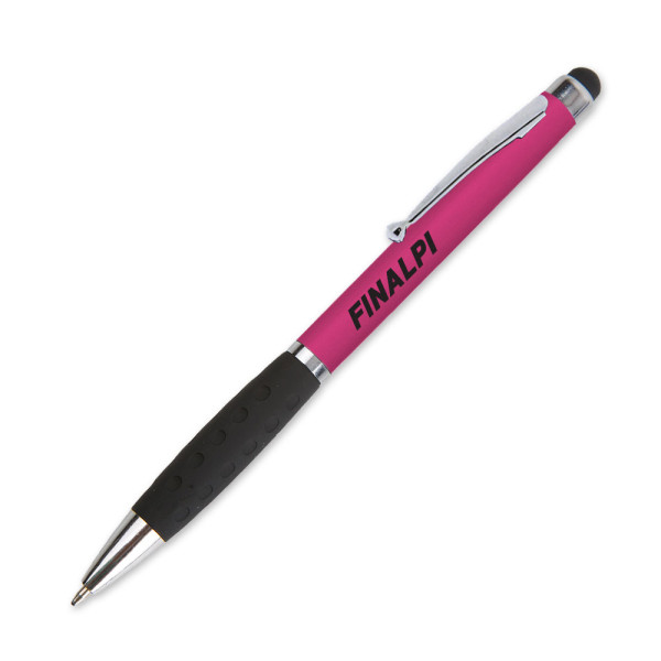 stylo à bille avec rotation, clip, anneau et embout chromé, FÛT rond coloré, poignée ergonomique en caoutchouc antidérapant noir, pointe pour l'écran tactile. Refil: bleu