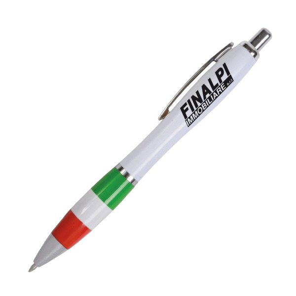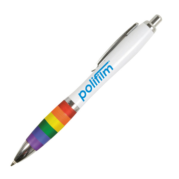 Stylo à bille en plastique avec clip en métal. Corps blanc, poignée ARC EN CIEL ou ITALIE, détails argentés, grand espace pour la personnalisation. Couleurs : arc-en-ciel, Italie Refil: bleu, noir
