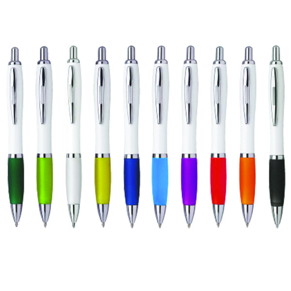 Stylo à bille en plastique avec clip en métal. Corps blanc, poignée colorée et détails argentés, suffisamment d'espace pour la personnalisation. Refil: bleu, noir