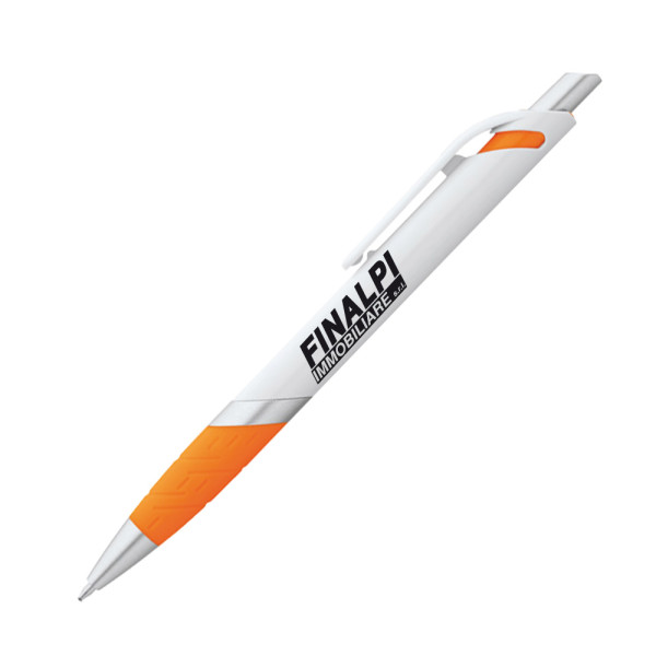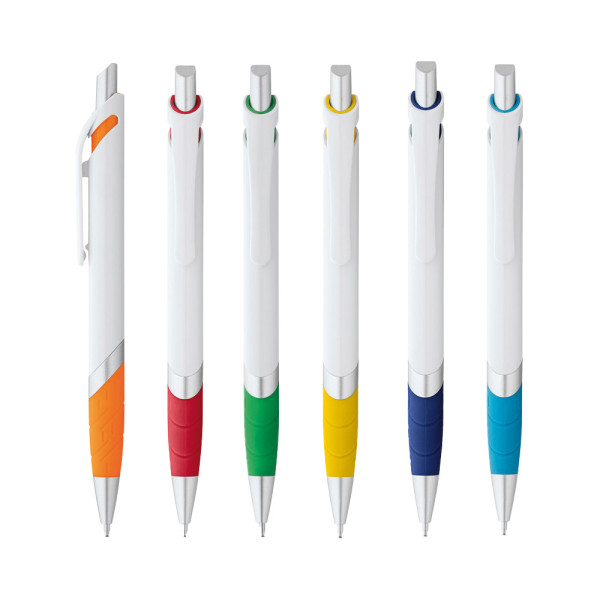 STYLO À BILLE À DÉCLENCHEMENT, EMBOUT RENFORCÉ ET BOUTON CHROMÉE, FÛT ROND BLANC, POIGNÉE ANTIGLISSE DE COULEUR, CLIP ET ANNEAU EN MÉTAL CHROMÉE.