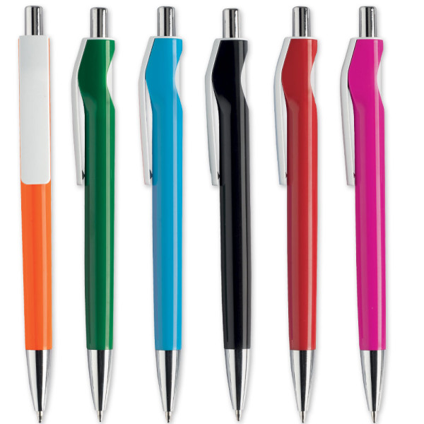 STYLO À BILLE À DÉCLENCHEMENT, FÛT FORMÉ DE COULEUR, EMBOUT ET BOUTON CHROME vaste espace pour l'impression SUR LA CLIP BLANC REFIL AVEC L'ENCRE DE NOUVELLE GÉNÉRATION. RFIL: BLEU
