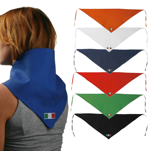 Foulard triangolare in 100% cotone, bordo cucito con ricamo della bandiera italiana sulla punta.