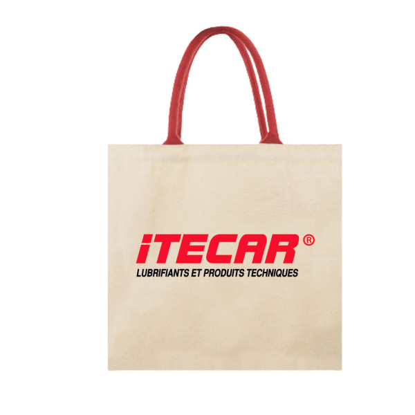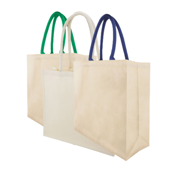 shopper in cotone naturale capace di sopportare fino a 10 kg di peso, con interno laminato e manici imbottiti colorati. Ampio spazio per la personalizzazione. Colore maniglie: ecrù, rosso, verde, blu