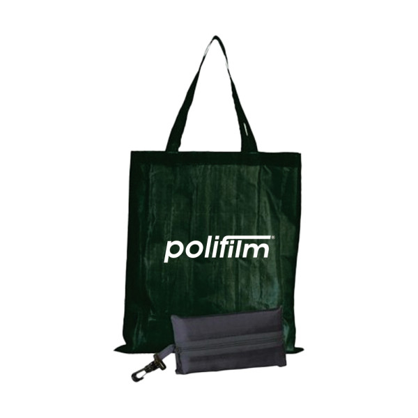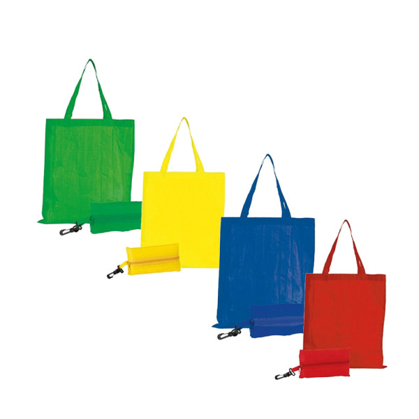 in poliestere 210D, shopper richiudibile in pratico borsello chiuso con zip e fissato alla borsa tramite gancio in materiale plastico, ampio spazio per la personalizzazione