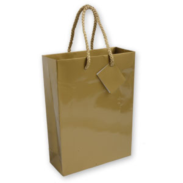 elegante borsa in carta laminata 157 g/mq, maniglie in cordino nel colore della borsa, rinforzo alla base, biglietto auguri inserito nella maniglia, ampio spazio per la personalizzazione.