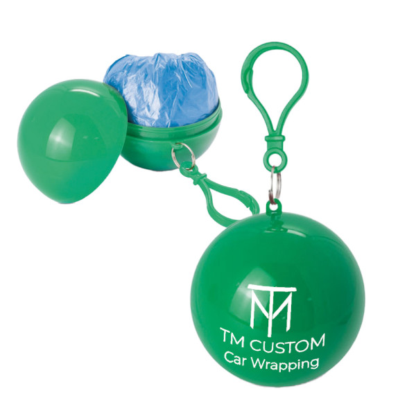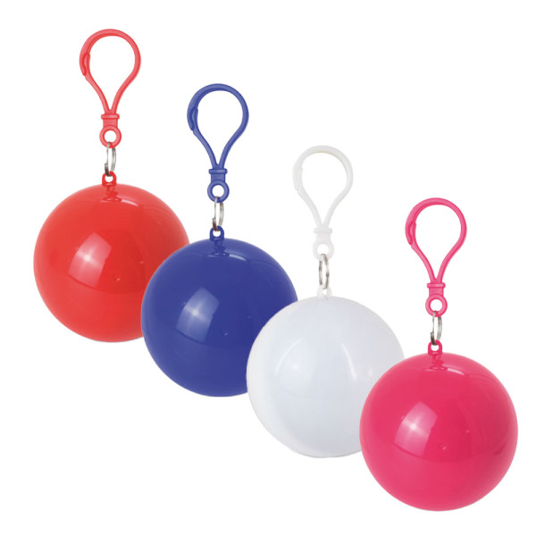 Impermeabile poncho ripiegato in una pallina con moschettone. Ampio spazio per la personalizzazione sulla pallina.
