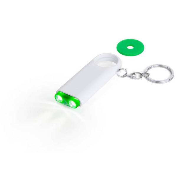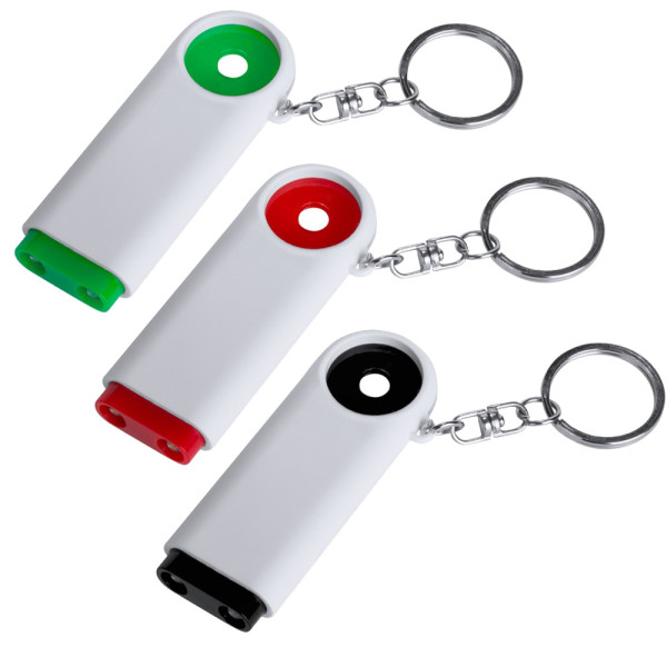 DI SICURO IMPATTO, IN MATERIALE ANTIURTO BIANCO, CON DUE LUCI LED, PULSANTE E GETTONE PER CARRELLO COLORATI, ANELLO BRISE' UNIVERSALE, PILA INCLUSA.