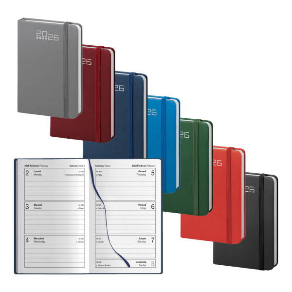 agenda settimanale copertina rigida chiusa con elastico, le versioni colorate hanno la copertina con impuntura perimetrale in materiale riciclato, la versione ecrù ha la copertina in cartoncino naturale.