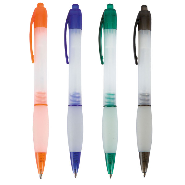 penna sfera a scatto impugnatura ergonomica in materiale antisdrucciolo bianco, fusto traslucido, particolari colorati. refil: blu