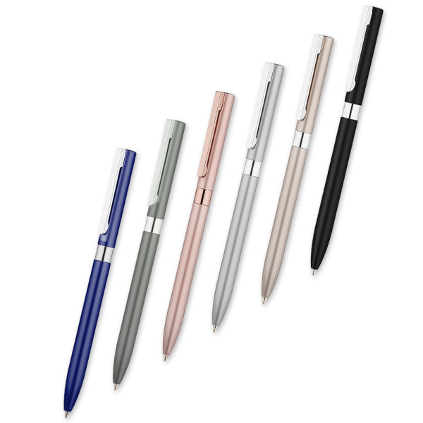 Elegante penna sfera in metallo movimento a rotazione, fusto rotondo colorato, clip ed anello cromati, refill gel di nuova generazione. Refil: nero