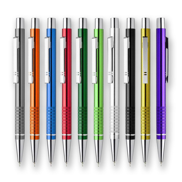ELEGANTE PENNA A SFERA A SCATTO IN ALLUMINIO, PULSANTE, ANELLO E PUNTALE CROMATI, CLIP IN METALLO, FUSTO ROTONDO COLORATO, REFIL CON INCHIOSTRO DI NUOVA GENERAZIONE DI COLORE BLU