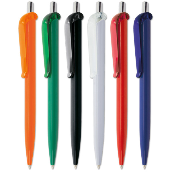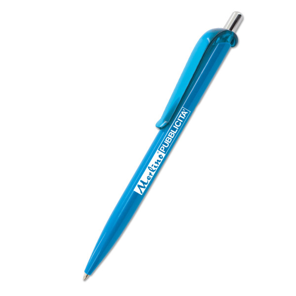 penna sfera a scatto, pulsante cromato, clip in materiale plastico colorato trasparente, fusto rotondo opaco, è possibile personalizzare anche la clip. Refil: blu