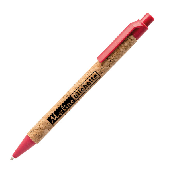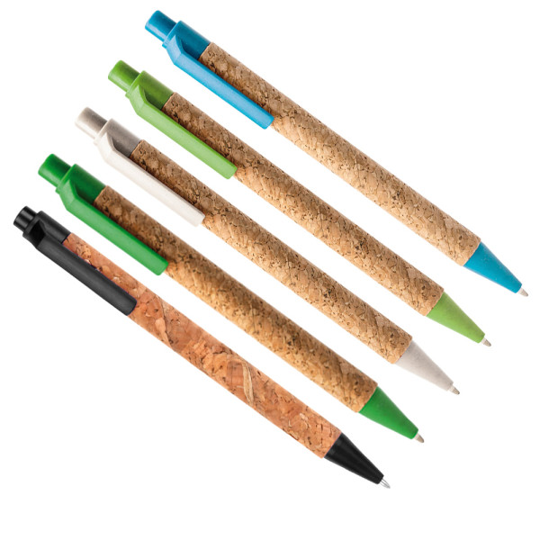 penna sfera a scatto ecologica in carta riciclata rivestita in sughero, pulsante clip e puntale colorati, fusto rotondo in sughero. Refil: blu