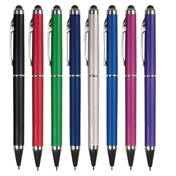 penna sfera a rotazione dal design moderno, all’estremità applicata la gommina per il touch-screen, fusto rotondo in materiale satinato colorato, puntale rinforzato, anello e clip in metallo cromato. Refil: blu